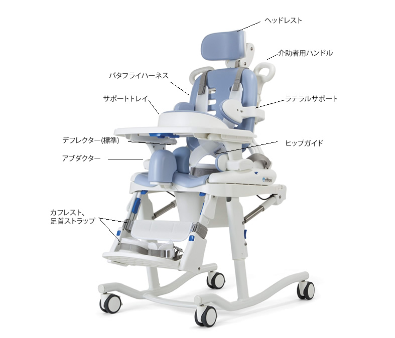 公式には、適切なポジショニング、快適性、介助者のアクセス性を高めることが特徴とされ、適応トイレシート・移動式トイレチェア・シャワーチェアとして使える構成が用意されています。
